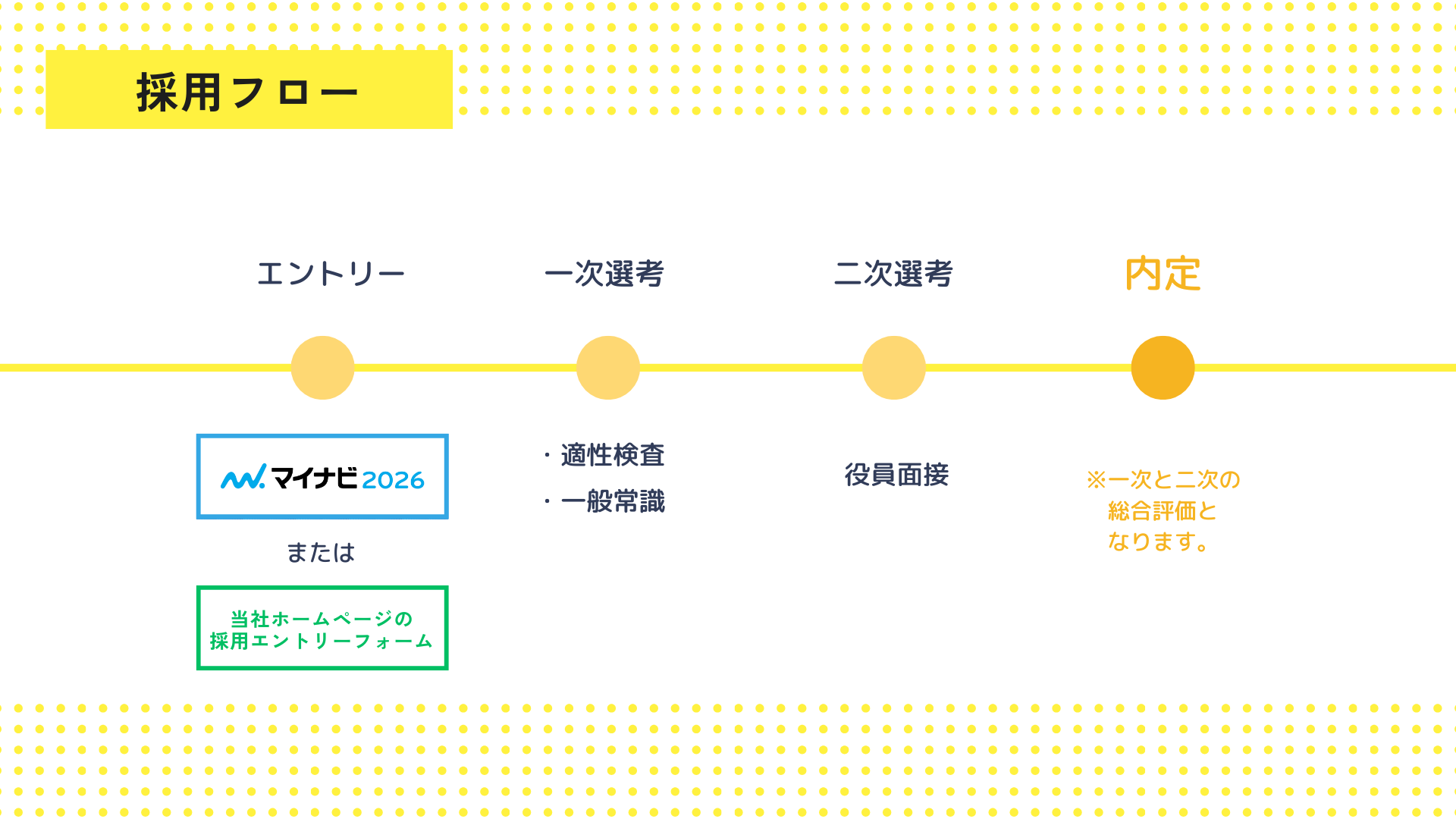 まずは「マイナビ」または「当社ホームページのエントリーフォーム」よりエントリーください。